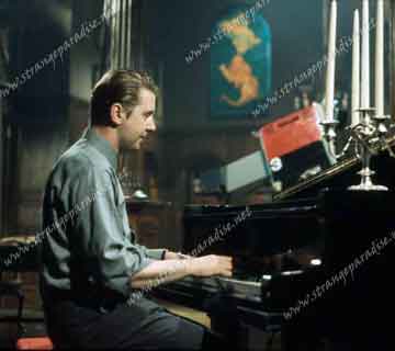 At right is another in our occasional series of behind the scenes photos. This particular photo was taken on the set of the drawing room of Desmond Hall. Although it was not often seen on the show, there was a piano on the set, and cast and crew alike would occasionally sit down and play. This photo captures cameraman George Klobouk taking his turn at tickling the ivories