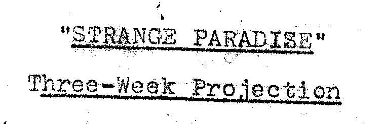 AOne of the most interesting periods of Strange Paradise was the last five weeks of the Maljardin storyline. During this time, the scripts penned by Ian Martin ran out, and a succession of writers was brought in to help keep the plotlines going. Eventually, due to fallign ratings, something of anoverhaul was called for. Incoming producer Bob Costello decided to move the show off the island of Maljardin to alocation where characters could more easily come and go. As a result, a number of cast members were scheduled to be killed off and a number of dangling plotlines were to be wrapped up. Writers would provide three week projections to indicate where storylines were going. At right is an excerpt from the three week projection covering the final 15 episodes of the Maljardin storyline (episodes 51-65). This particular excerpt shows a small change for the character of Dan Forrest. Originally, Dan was supposed to die in episode 49, but was temporarily saved so that he could die at the hands of Jean Paul's wife Erica.