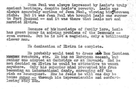 November 10, 2008 - Character Outline for Laslo Thaxton At right is the original character outline for one of the new characters in the Desmond Hall storyline, Laslo Thaxton. Played by Jack Creley, Laslo became Jean Paul's main human nemesis after his journey from Maljardin to the ancestral home of Desmond Hall. As can bee seen in the document, the original backstory envisioned Laslo as "attractive to women everywhere" and having him brought to Desmond Hall and introduced to Elvira (the original name for Ada) by Jean Paul, all items that were either dropped or changed for broadcast. Additionally, Laslo was originally to be the keeper of the Desmond family knowledge, a task that eventually went to researcher Emily Blair.