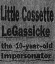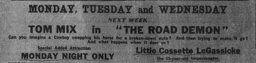 November 3, 2008 - Cosette Lee Billing This week the archive goes all the way back to 1920 to bring you Cosette Lee's first professional billing. At age 10, Cosette Lee performed as an impersonator as an opening act at a local movie theater. As you can see by the ad, she had not yet adopted her stage name of "Lee" and was billed under her real last name of Le Gassicke. Also not the misspelling of her first name as "Cossette."