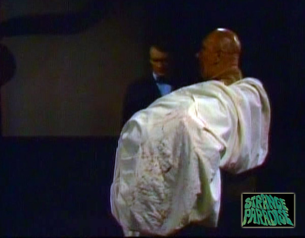 Quito enters the main hall, carrying the Reverend’s body. Erica tells Jean Paul that he jumped from the roof even though she tried to stop him. Jean Paul is stunned, and does not acknowledge what Erica has said. He refuses to hold Erica and tells Quito to take the body to the crypt. He wonders why the Reverend would kill himself since he was a man of God and believed in life. Erica tells him that the Reverend was tortured by doubts and that she was trying to help him overcome them. She thought that if the Reverend stood under the stars that the wonder of his god might be returned to him. She begins to cry, saying that she killed the Reverend. Jean Paul is now convinced that Erica is innocent and that she was only trying to help. Erica tells Jean Paul that the Reverend told her that he was being tortured by demons.