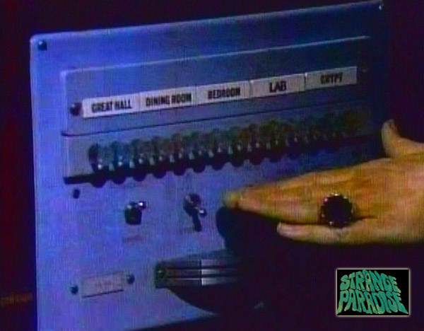 The control box in the secret room is labeled, from left to right, Great Hall, Dining Room, Bedroom, Lab, and Crypt. |