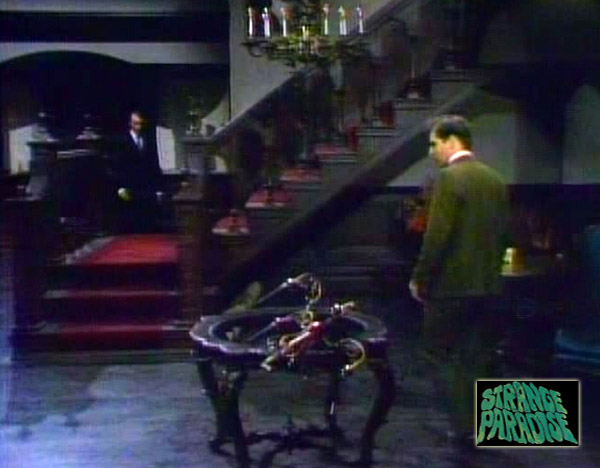 The séance table is on a stand in this episode (image 1). This stand mysteriously disappears in episode 38, after Quito has cleaned up the broken glass from when the chandelier fell, despite the fact that the chandelier and table are still there (image 2). Did Quito simply lift them up, remove the stand and them put them back? |